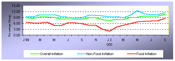 The average annual rate of inflation for the period January to October 2000 stood at 9.1 per cent as compared with 8.6 per cent for the corresponding period of the preceding year. This is the fourth successive year to record a single digit inflation figure. The sharp increase in the average annual rate of inflation during 2000 was largely attributable to the high prices for imported goods, spearheaded by persistent increase in fuel price.