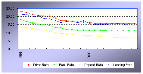 The money market rates in Namibia by and large remained steady or declined during the current year. However, in the wake of the higher inflation witnessed during the year the real interest rates have been declining throughout the year. The low interest rates led to a sizeable expansion in private sector credit as compared with the previous year. It has, however, been observed that while there has been a marked increase in credit to the private sector related to individuals, credit to business or investment purposes however did not take off as expected. Thus, lack of adequate flow of credit for investment purposes may have been responsible for the slow down in the growth process during the first half of 2000.