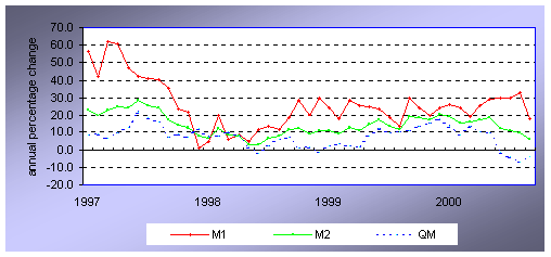There has been an acceleration in the average annual growth of broad money supply (M2) during the first half of 2000 as compared with the corresponding period of the preceding year. However, the situation got reversed during the third quarter of 2000 when the average annual growth rate of money supply decelerated to 8.7 per cent as compared with a growth of 14.4 per cent in the corresponding quarter of 1999. The annual rate of increase in broad money supply for the year ending September 2000 was 5.7 per cent, significantly lower than the 18.6 per cent level recorded for the year ending September 1999. The slow down in the growth in money supply as at end September 2000 is mainly attributable to the decline in the net foreign assets of the banking system. The main factors responsible for the increase in money supply during the year was private sector credit, which increased by 13.1 per cent as at end September 2000. This sharp increase in private sector credit occurred in the wake of relatively low interest rates since the later part of 1999.