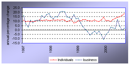 The private sector credit, however, was characterised, as indicated by the chart below by a strong growth in credit to individuals. The annual growth rate of credit to individuals remained above 10 per cent throughout the year and as at the end of September, it reached a peak of 18.2 per cent. It is encouraging to note that there has been a turn around in the annual growth rate of credit to the business sector apparently responding to lower interest rates during 2000. The growth rate, which was still negative as at the beginning of the year turned positive towards the end of the first quarter (3.2 per cent in March). It started rising steadily thereafter to reach a peak of 11.8 per cent as at the end of June 2000.