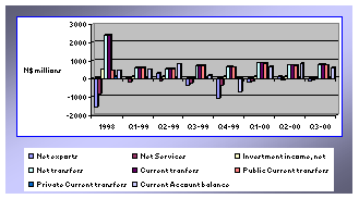 The balance of payments struck a favorable note during the first nine months of 2000, similar to the developments witnessed during the same period in 1999. It increased by N$ 553.1 million to reach a level of N$ 2 012.0 million by September 2000. The favourable situation was an outcome of high SACU transfers coupled with a substantial improvement in net services(chart 7) which offset the effects of the worsening trade balance.