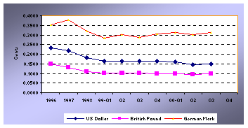 The depreciation was mainly caused by the appreciation in the external value of the US dollar that gained momentum against other major currencies in the international currency market and the investment concerns in the global financial markets about Sub-Saharan Africa following the land crisis in Zimbabwe. However, this downward pressure on the Namibia dollar suffered against major currencies in the first half of 2000 did not continue in the third quarter. A recovery in the external value of the currency came about mainly because of the return of business confidence in sub-Sahara and the weakening in the value of the US dollar against other major international currencies. However, this recovery in the third quarter did not last long as the external value of the Rand and therefore the Namibia dollar has depreciated against the U$ dollar in the first two months of the fourth quarter of 2000.