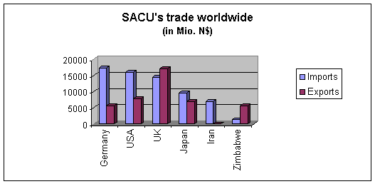 SACU is – next to SADC - Namibia’s most important trading partner. Nearly of Namibia’s imports from SACU originates from South Africa (value 1997: N$ 6,889 Millions). The imported goods with the highest value are vehicles, electrical machinery, mineral fuels, articles of iron and steel, beverages and spirits, paper, sugar, articles of apparel, pharmaceutical products, rubber and plastics.